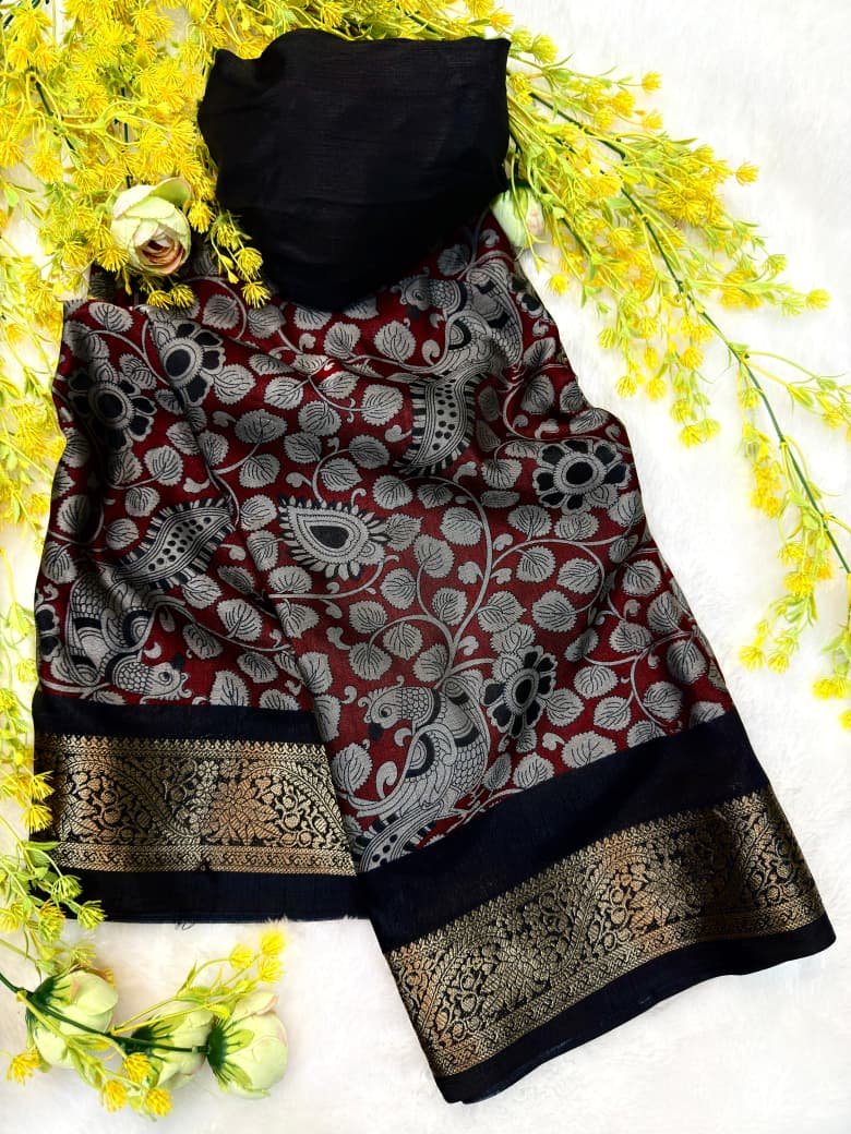 – Soft black dola silk saree with pen kalamkari design