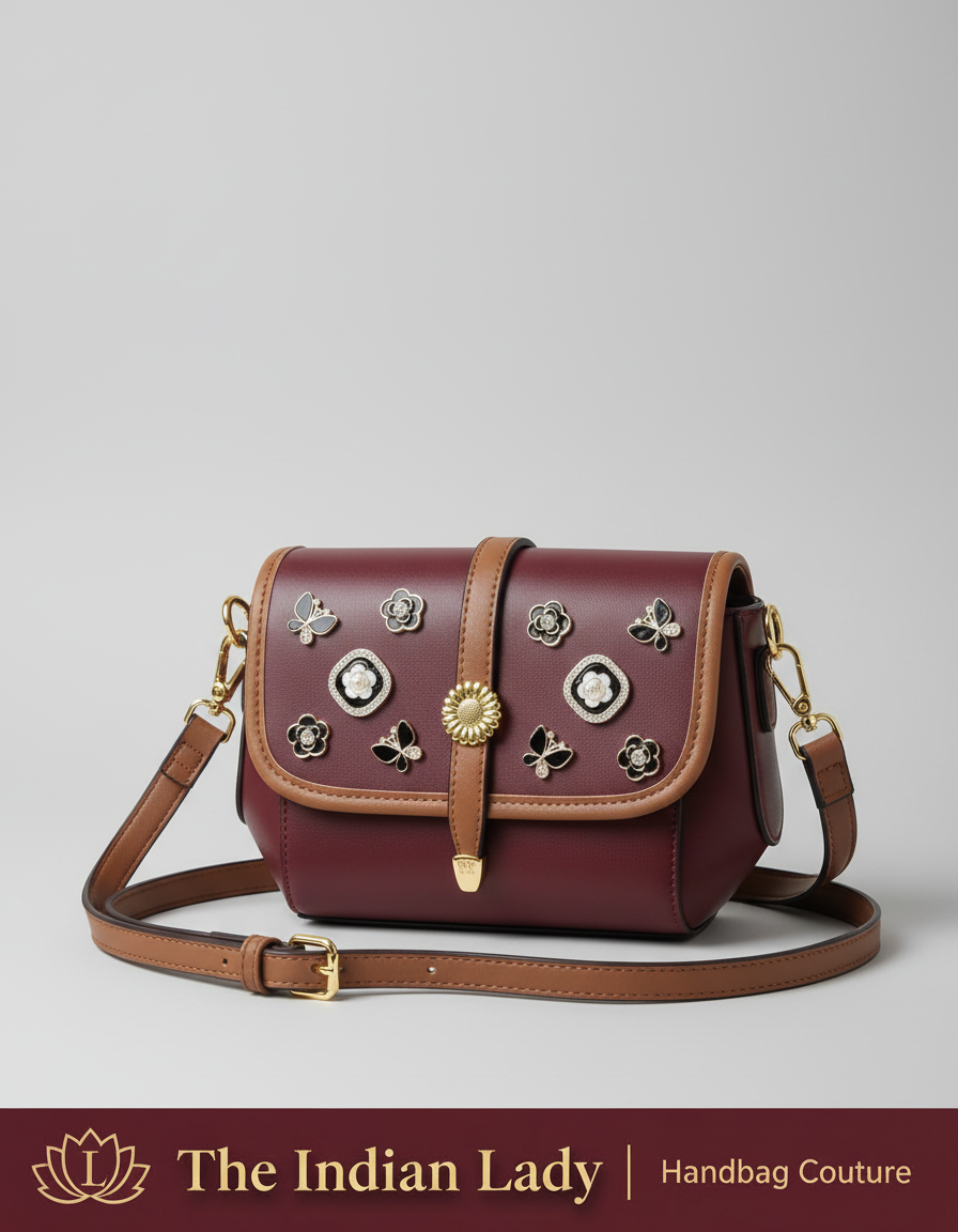 Add a touch of elegance to your outfit with our stunning burgundy leather handbag, adorned with intricate floral and butterfly embellishments. This luxurious bag features a gold clasp and a comfortable brown strap, perfect for a sophisticated look.