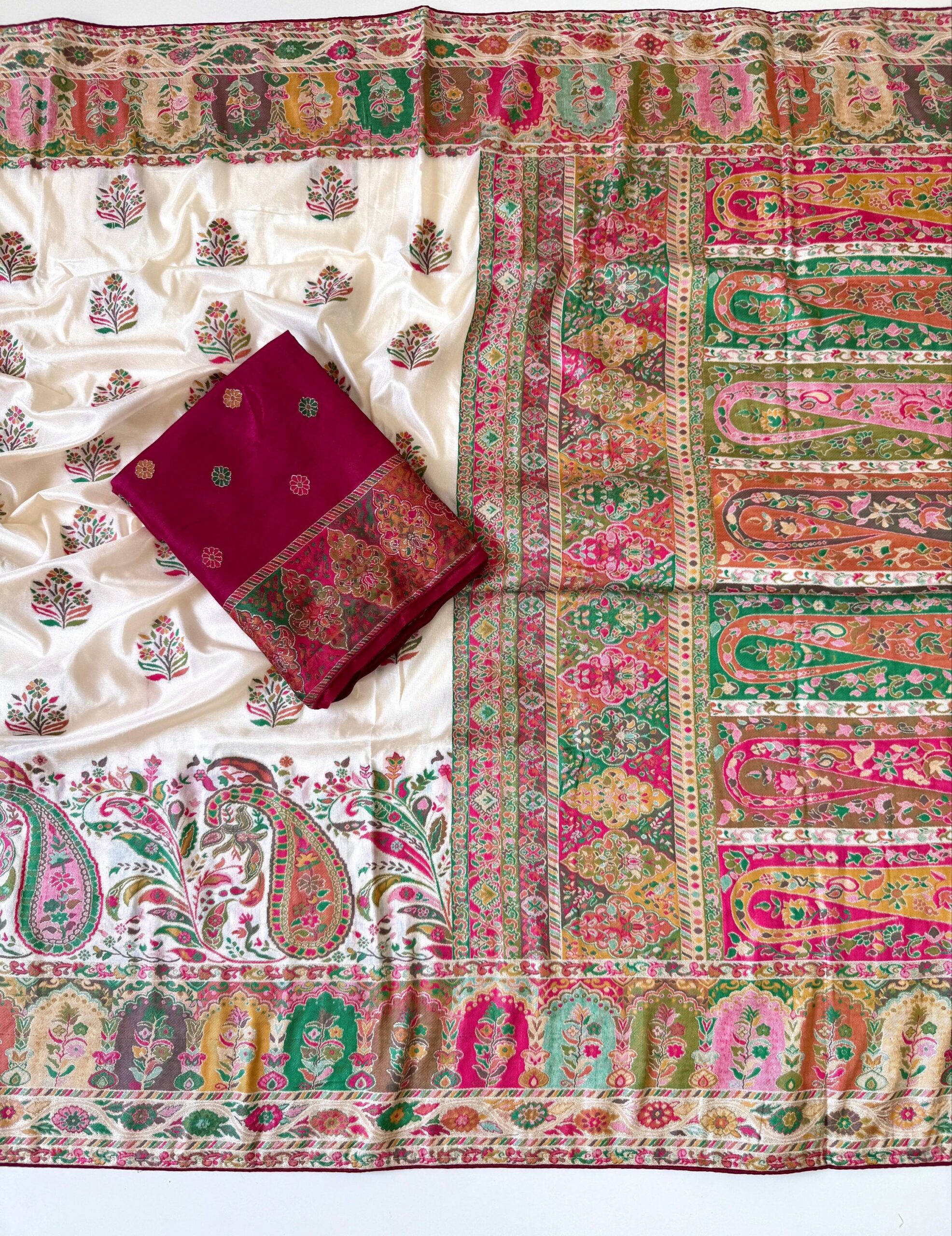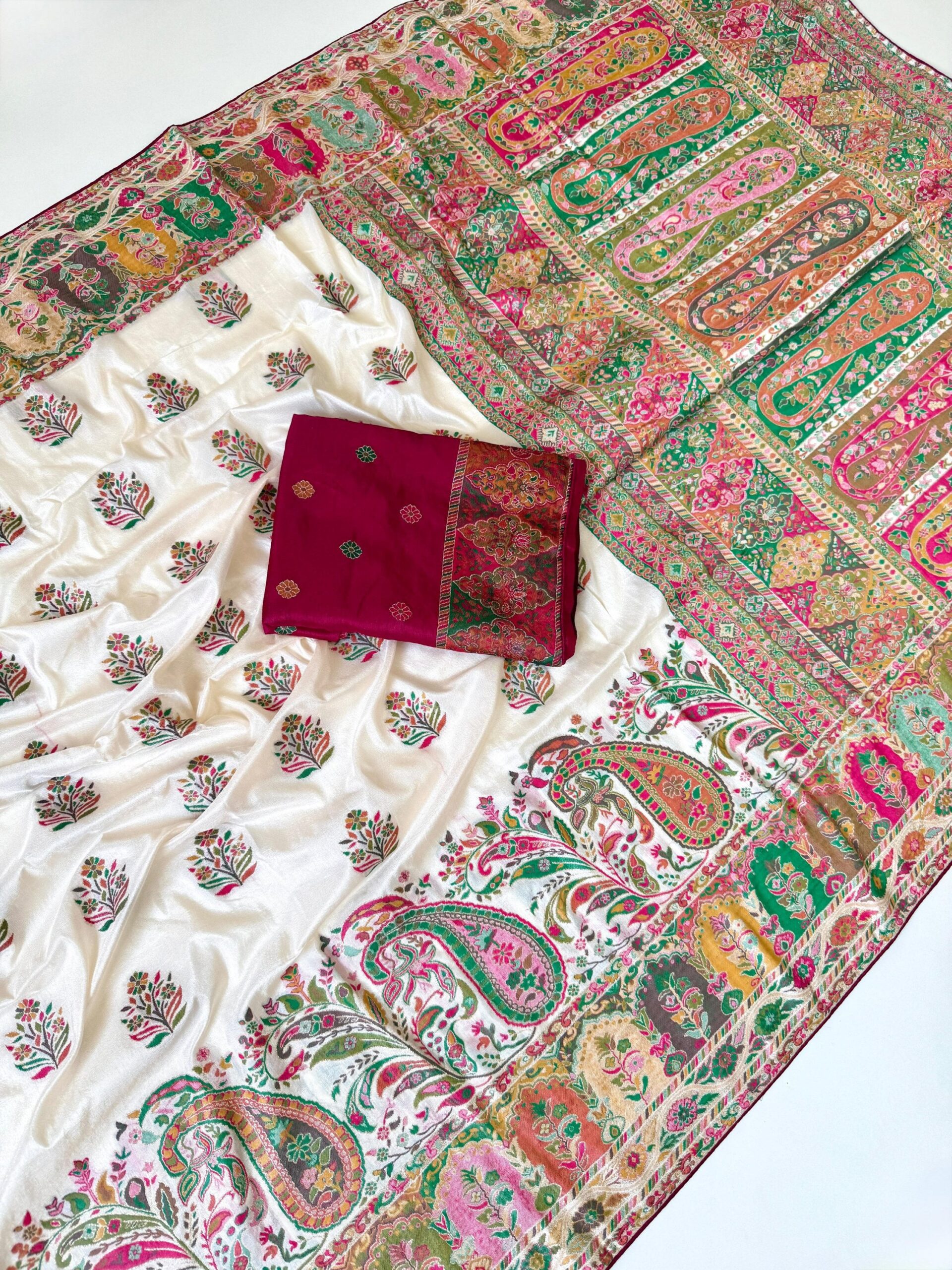 1. *Fabric*: Pure heavy Rajwada Pasmina Silk with Minakari Jaquard weaving and embroidery work on the border and pallu.
