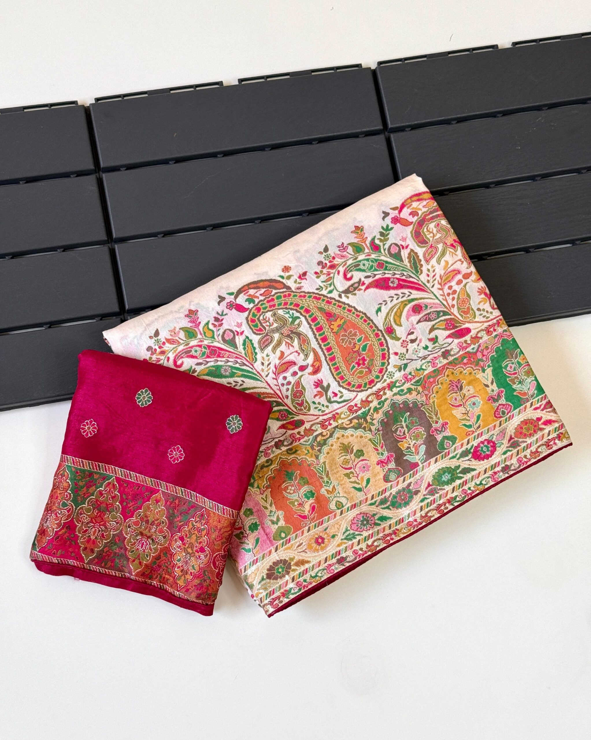 3. *Components*: 6.50‑meter saree with a running blouse piece (magenta fabric shown alongside).