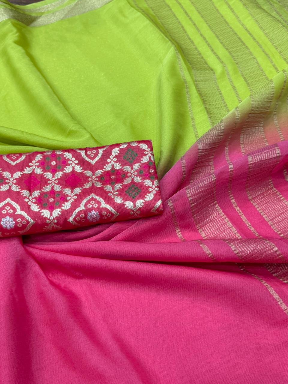 Elevate your ethnic wardrobe with our stunning Pure Shimmer Chiffon Saree, featuring intricate Chit Weaving Pallu and Rich Jari Weaving Border. Handcrafted with 2D Jaipur Dyeing, this saree is a masterpiece of elegance.